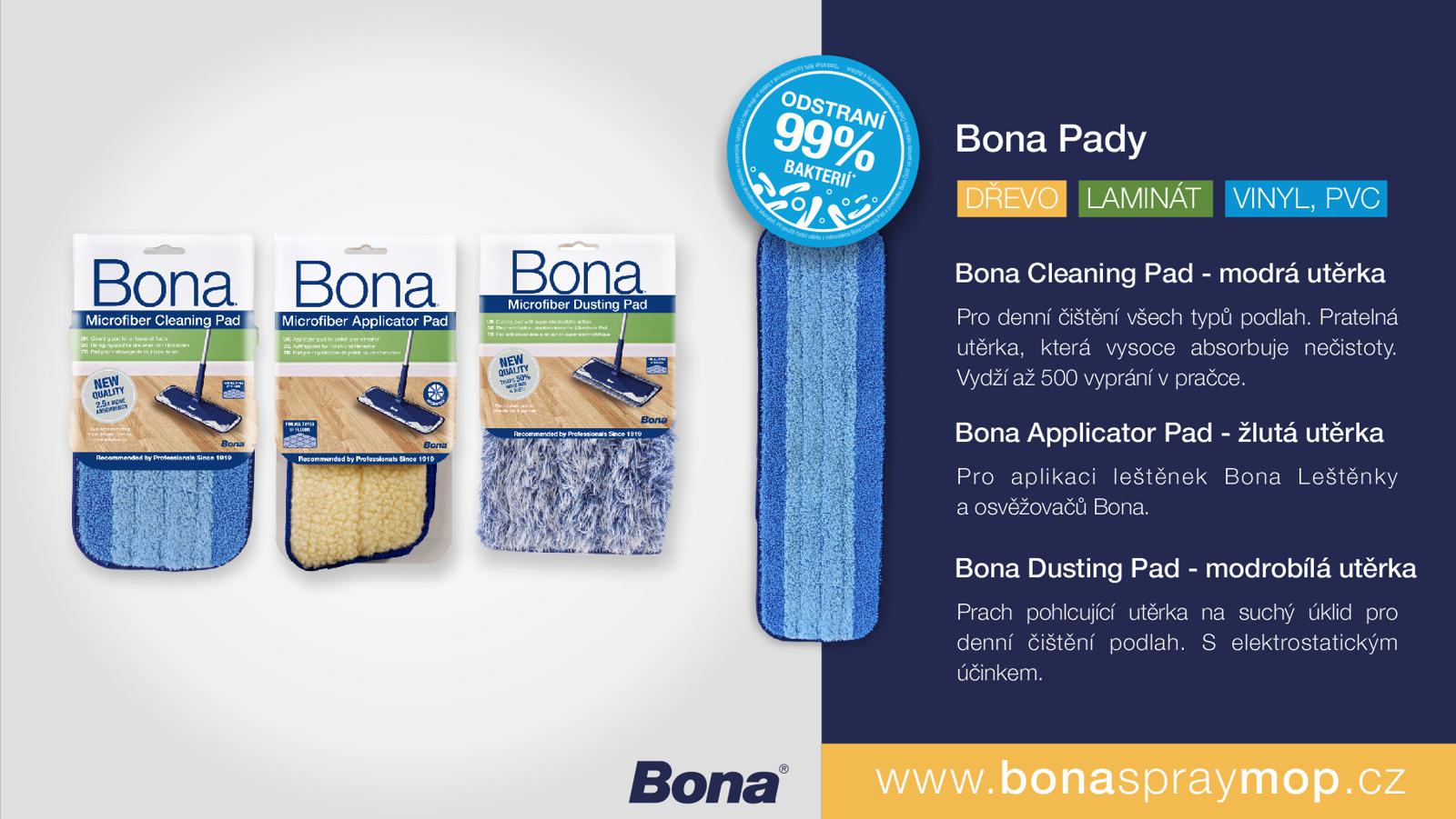 Před samotným čištěním je třeba vysát nebo odstranit nečistoty z podlah pomocí Bona Dusting Pad (prachovky) nebo vysavače. Všechny Bona Pady (utěrky) z mikrovlákna jsou vyrobeny z vysoce kvalitních materiálů a jsou vhodné pro praní v pračce. Utěrka vydrží až 500 praní. Po celou dobu si zachová svou účinnost. Nepoužívejte aviváže. Bona utěrky jsou vyrobeny z 90% z recyklovaného materiálu.